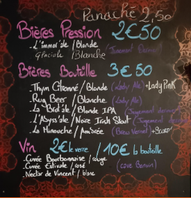 L’association est détentrice d’une licence III qui nous permet de vendre des boissons alcoolisées de moins de 18° : bières locales et vin. Nous proposons également des boissons sans alcool : jus de fruits, sirops et limonade ainsi que des boissons chaudes : café, chocolat chaud, thé et tisanes.